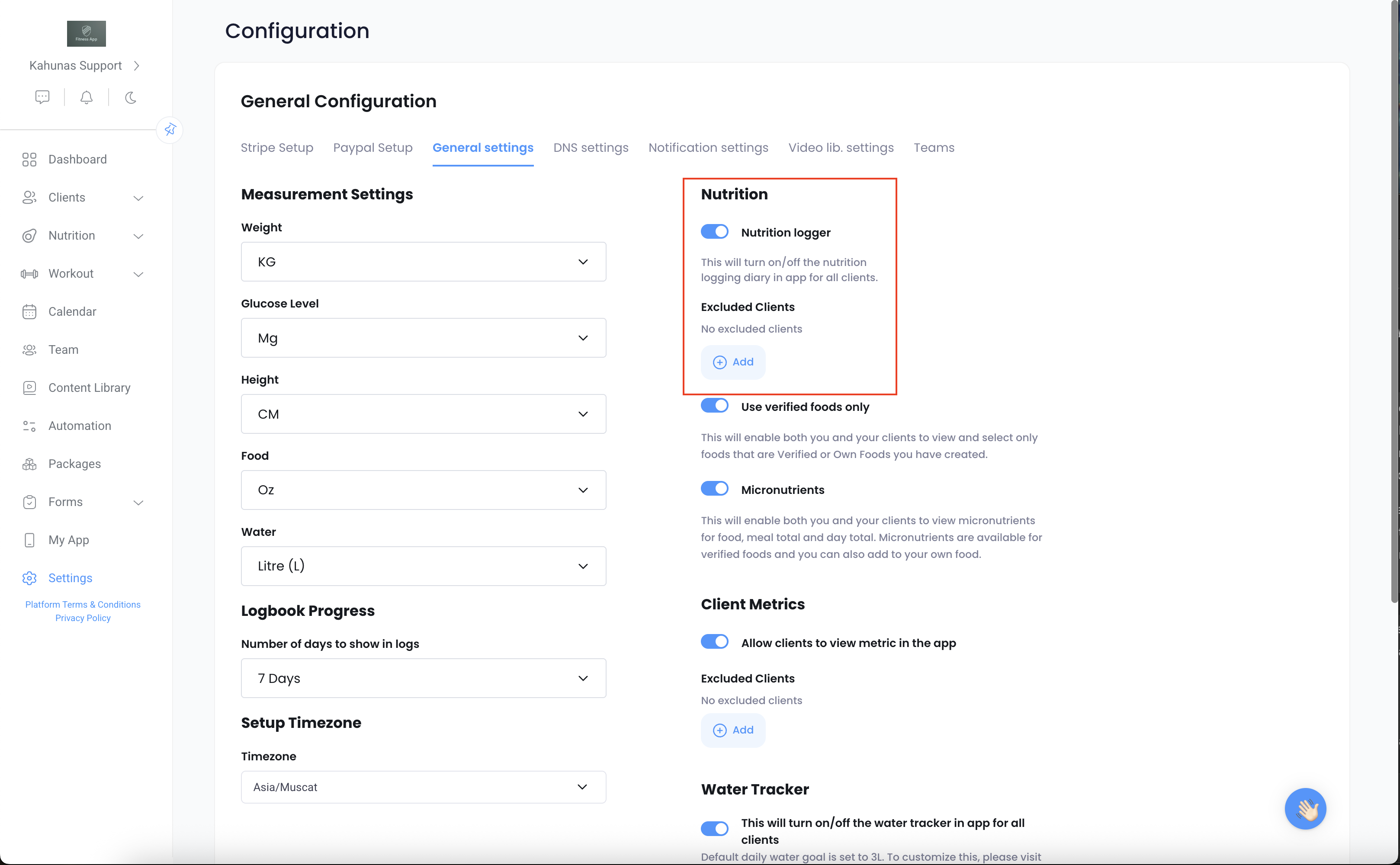 Coaches can also disable the nutrition logger for a specific client by adding their email address and save the settings.