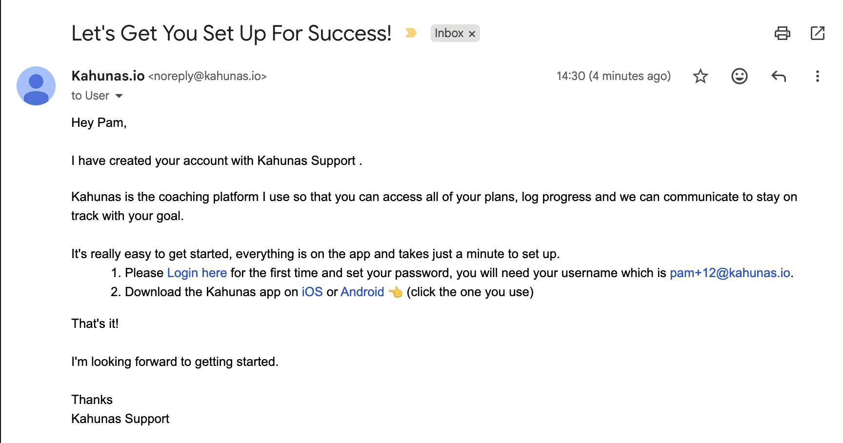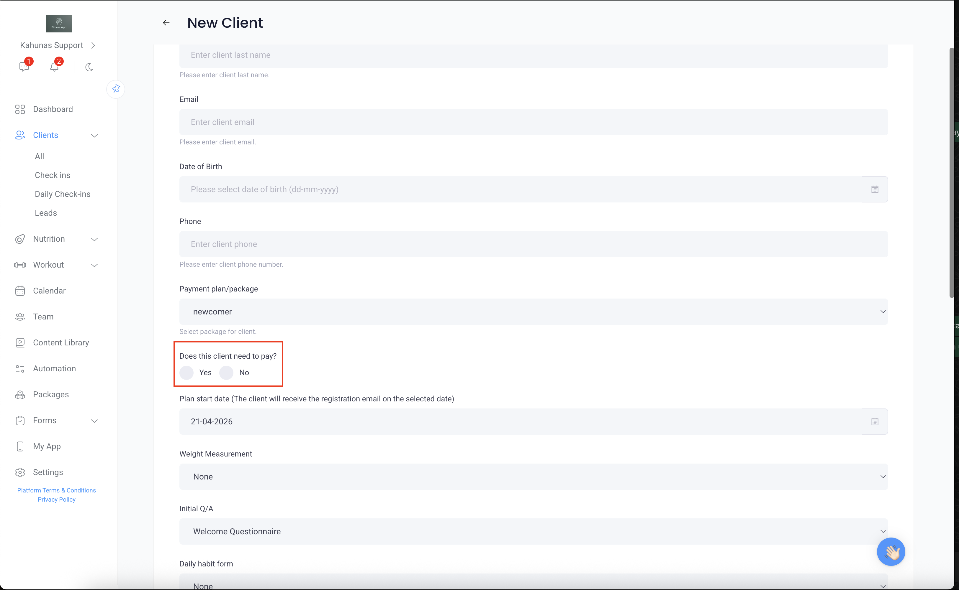 Once added, the client will receive a registration email. After signing up, they can log in via kahunas.io, where they’ll be prompted to complete the payment before accessing the app.