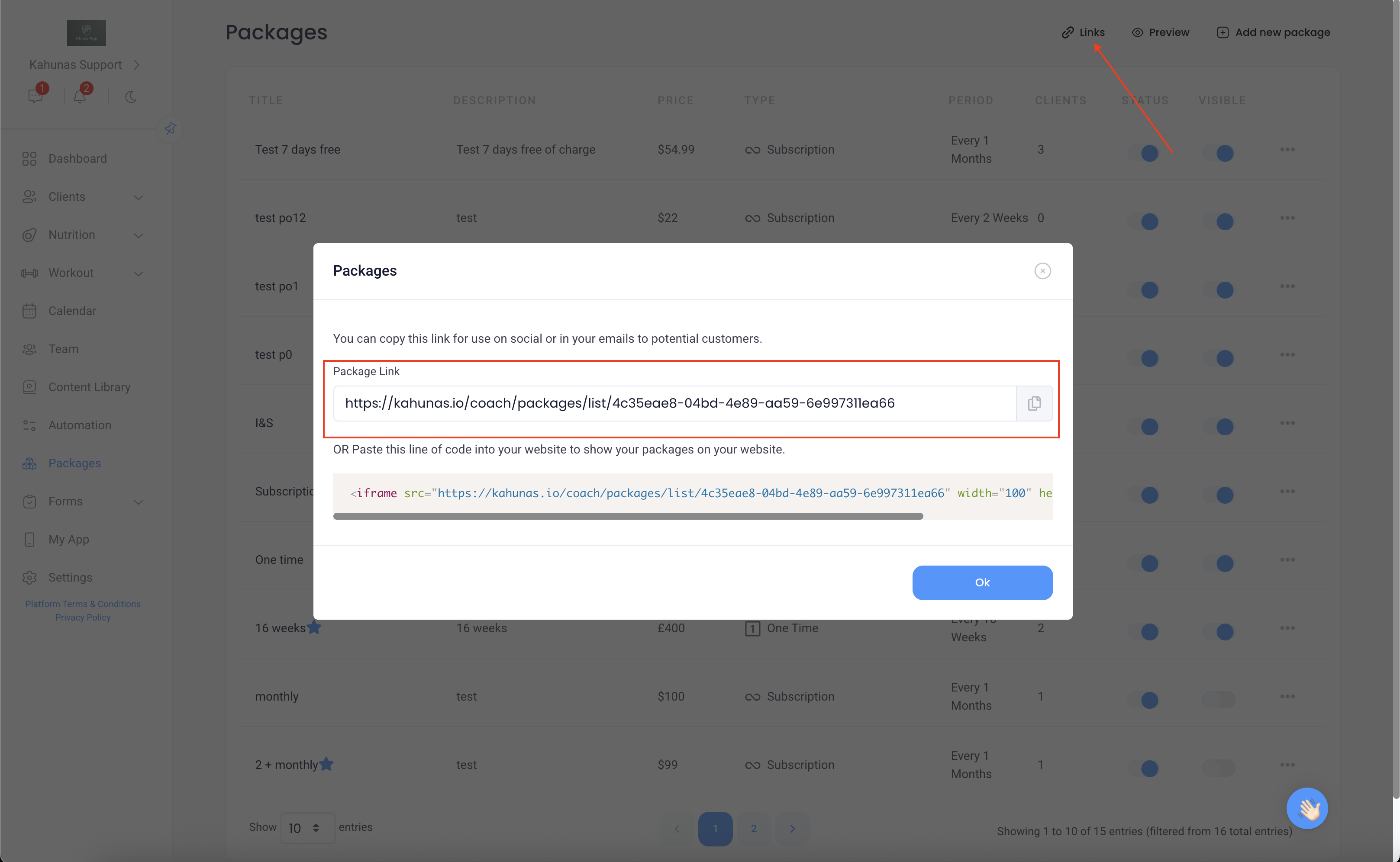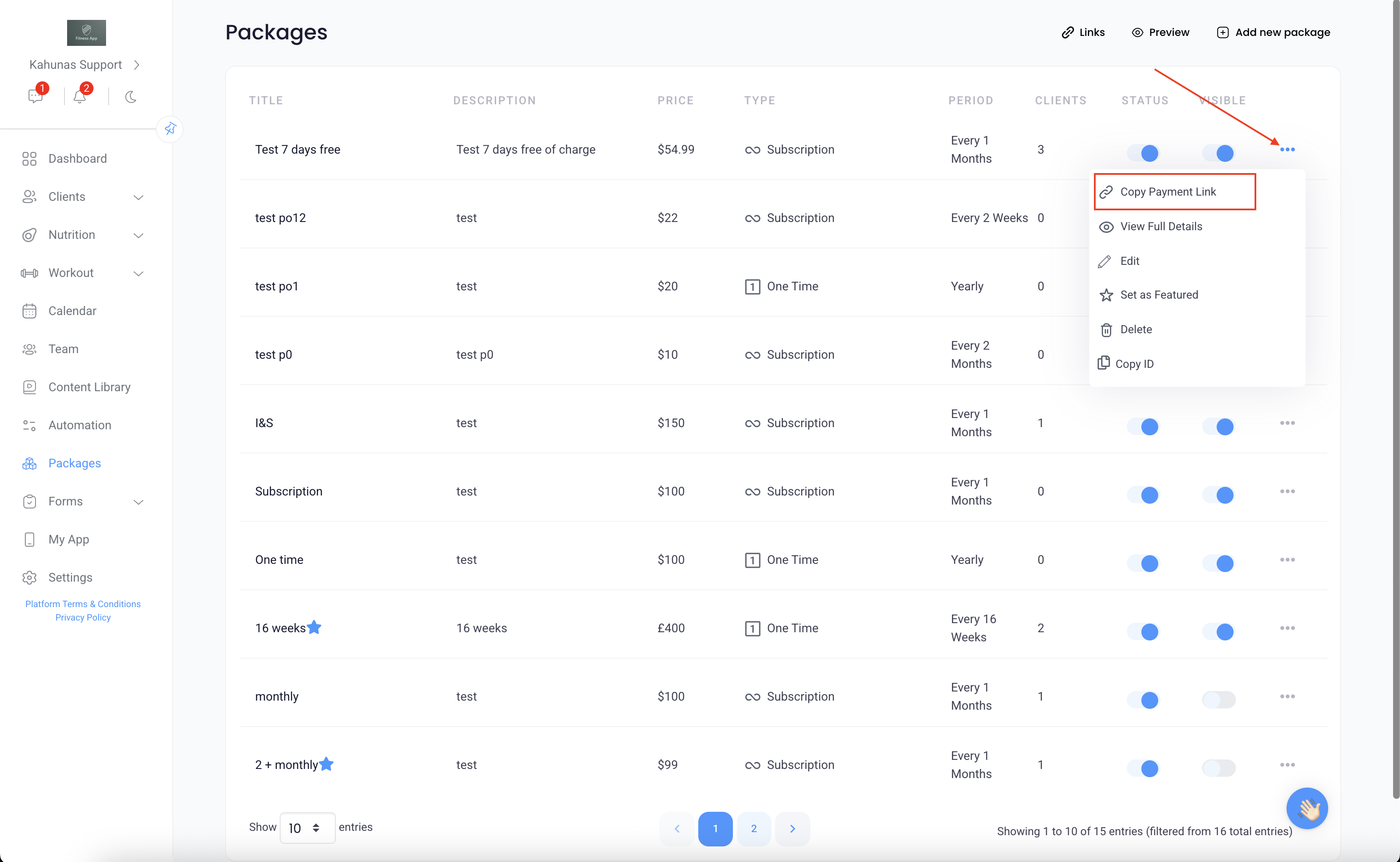 If you’d like them to sign up for a specific package, just click the three dots next to that package and select “Copy Payment Link.” When the client opens that link, they’ll be prompted to register and will be directed straight to that specific package for payment.
