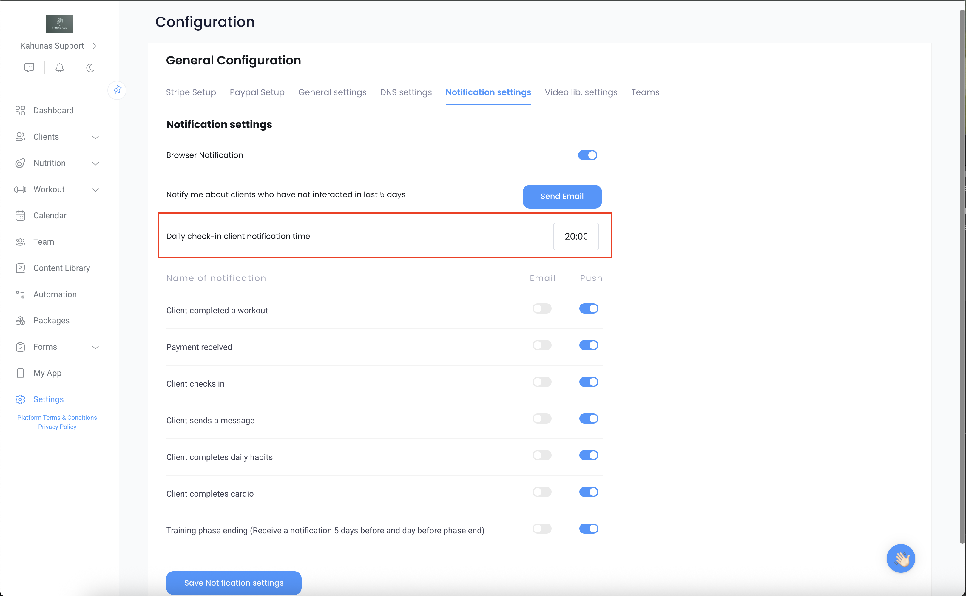If you’d like to adjust when they receive this reminder, you can do so by going to Settings in the sidebar, then selecting Notification Settings, and updating the “Daily check-in client notification time”.
